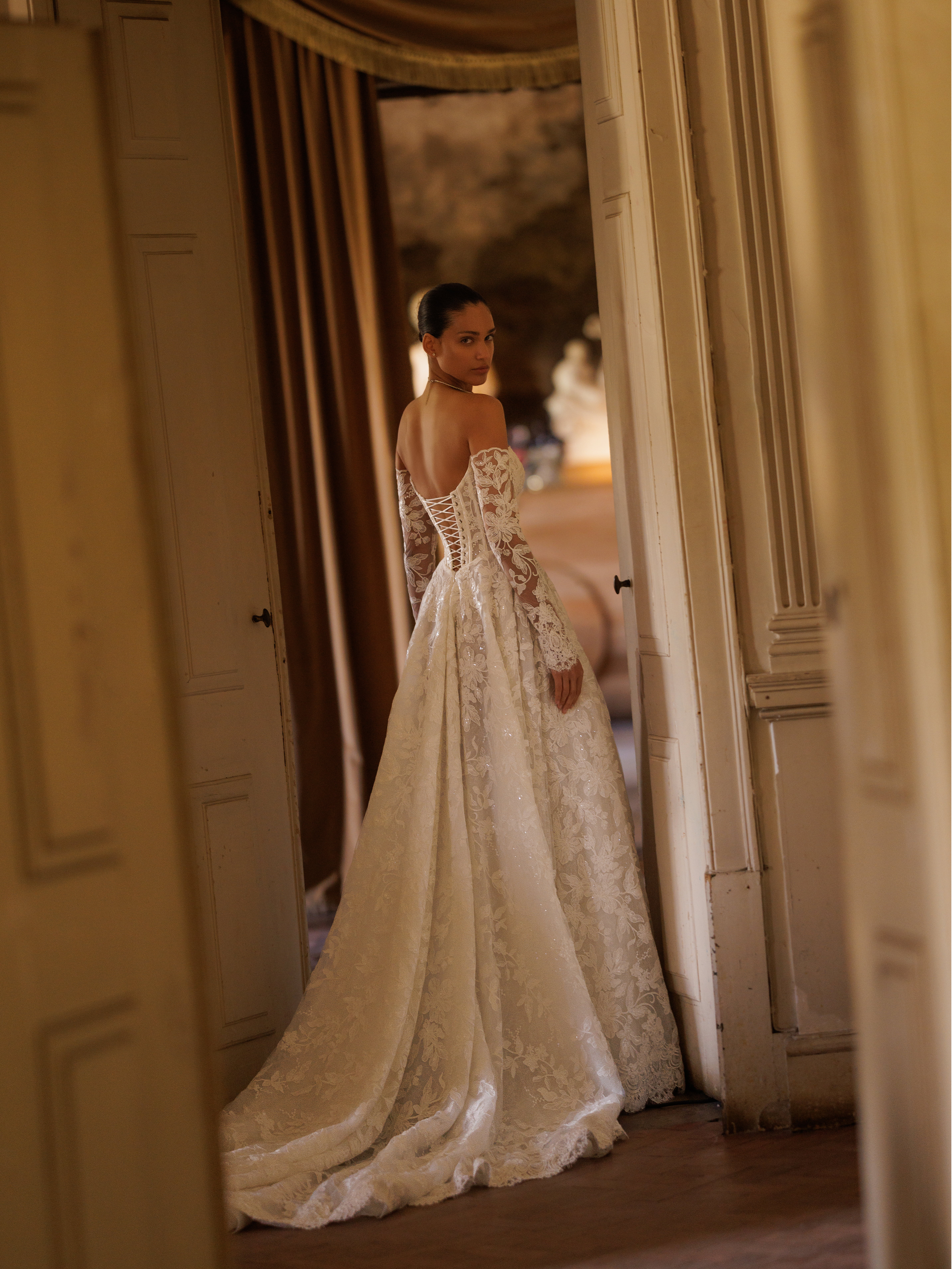 Fortuna je romantična i profinjena vjenčanica A‑line siluete koja savršeno spaja klasičnu eleganciju s nježnim, ženstvenim detaljima – idealna za mladenke koje sanjaju o bezvremenskom i sofisticiranom bridal izgledu. Haljina je izrađena od delikatne čipke i šarmantne Chantilly čipke s diskretnim sjajem, što joj daje teksturalnu ljepotu i lagan, zračan osjećaj. Duge, prozirne rukave od iste čipke krase skriveni patentni zatvarači na manžetama za besprijekoran i elegantan završetak. Gornji dio haljine ima srcoliki (sweetheart) izrez s off‑shoulder detaljima koji nježno otkrivaju ramena i naglašavaju dekolte, dok tradicionalni korsetski sustav vezanja omogućuje savršeno pristajanje i lijepo oblikuje struk. Suknja se lagano širi u A‑line siluetu, a vlek dužine chapel s čipkastim detaljima prema dnu daje haljini romantičan i svečan karakter – prekrasan efekt za ceremoniju i fotografije. Fortuna je savršen izbor za mladenku koja želi profesionalan, romantičan i elegantan izgled, spajajući klasične linije s detaljima koji odišu nježnošću i luksuzom.